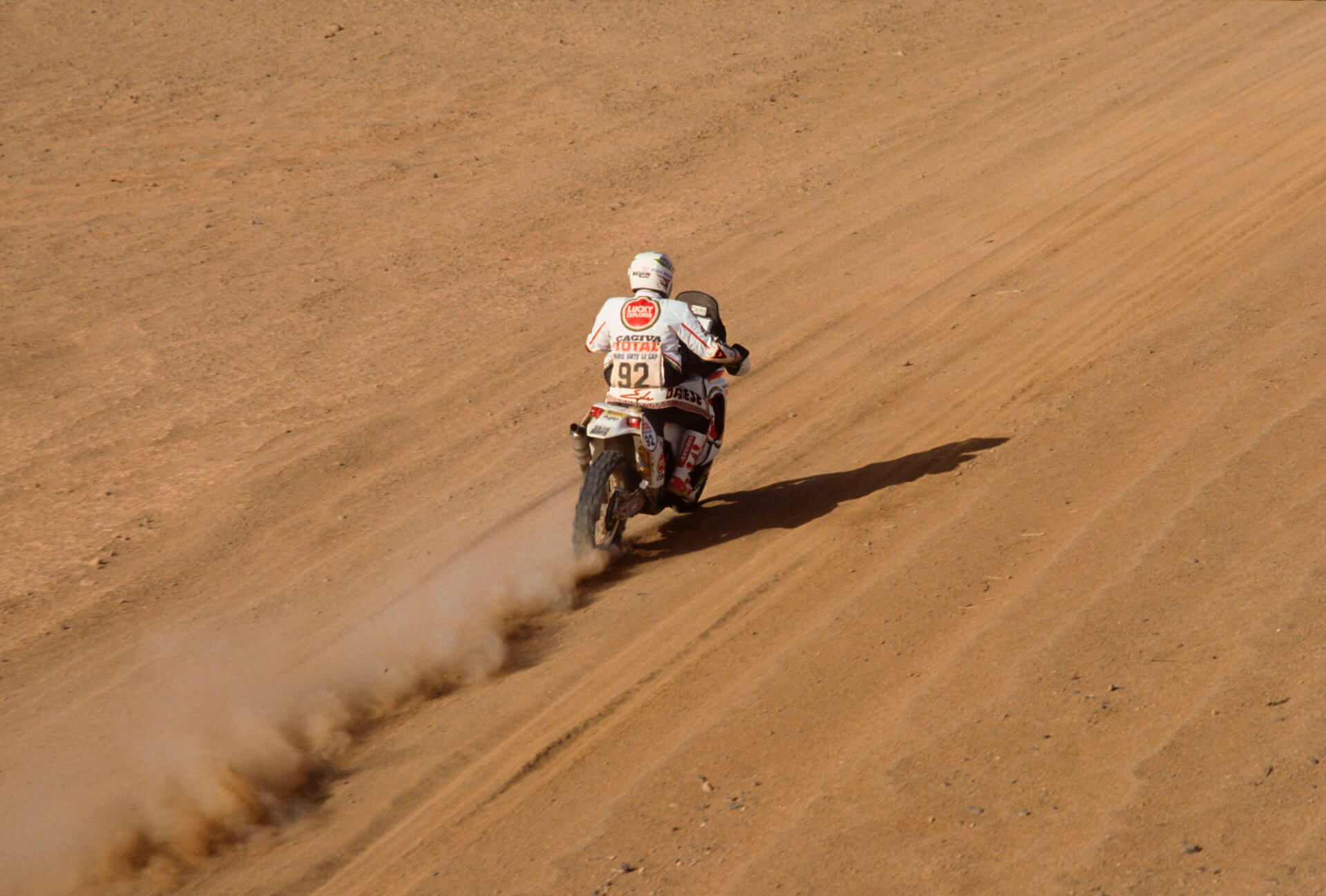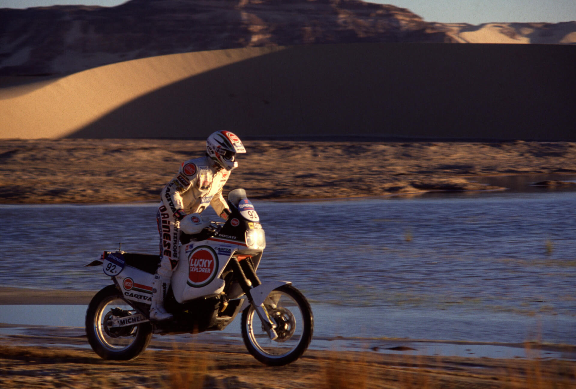 WRONG TRACK! The 1990 Paris-Dakar edition was a real triumph for Cagiva, but in an 800 km long leg, starting from N’ Guigmi and arriving in Agadez, the organisation had put the start flags on the wrong track: the first 30 drivers left and to the track to the right, while Orioli, who had studied the military maps, knew they would have had to go left. Nevertheless, he followed them and after only 20 km they all stopped. Something was wrong. They went back, driving 10 km out of track yet they realised they still were not going in the right direction. In the meantime Orioli had understood where he should be heading. In order to avoid being followed by the others, he stopped, pretending a break-down, while he checked how much petrol he had left: the first refuelling would be 420 km from the start; they had already done at least 25 km and he had a maximum autonomy of 460 km. The others returned to the starting point and started again from there, while Edi proceeded from that point until he reached the right track, carved in the sand. Incredulous, he noticed that it was already marked by the tracks of other bikes: the private riders had already gone ahead. He then continued at maximum speed to the refuelling point. From there, there were still 400 km before the finish line. That day Orioli covered 850 km in the Tenéré desert. He arrived at half past five in the evening, with the sun in his eyes. He found Azzalin welcoming and embracing him, telling him that he had been outright heroic, comparing his achievement with that of Fausto Coppi on the Stelvio pass. The team knew everything. Edi hadn’t missed a single point of the road book, while for the others it was a massacre: Peterhansel got lost in the dunes, Neveu, chasing Orioli, broke the gearbox, Mas got bogged down and arrived 45 minutes later, Franco Picco and Ciro stayed in the background, panicking because they hadn’t seen Edi, who instead gained an hour and a half on all the others. That year the Lucky Explorer team took its first victory with one of its official riders and the Schiranna brand issued the new Elefant 900 IE in a limited edition of 999 pieces, with a silver key ring signed by Edi Orioli in person. Edi had become the symbol of the brand, but at the time he did not realise it.